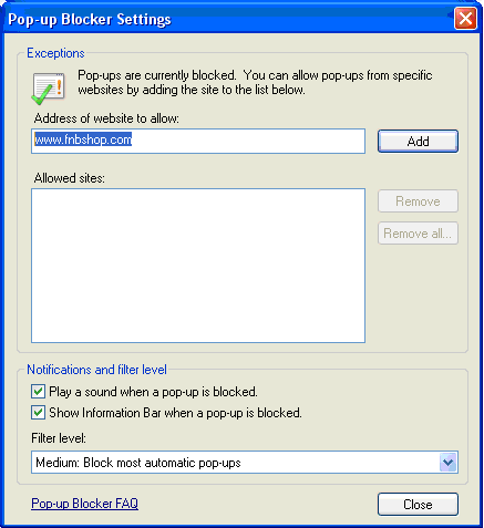 Type "www.fnbshop.com" into the "Address of Web site to allow:" field then hit the "Add" button to move the domain into the "Allowed Sites" list